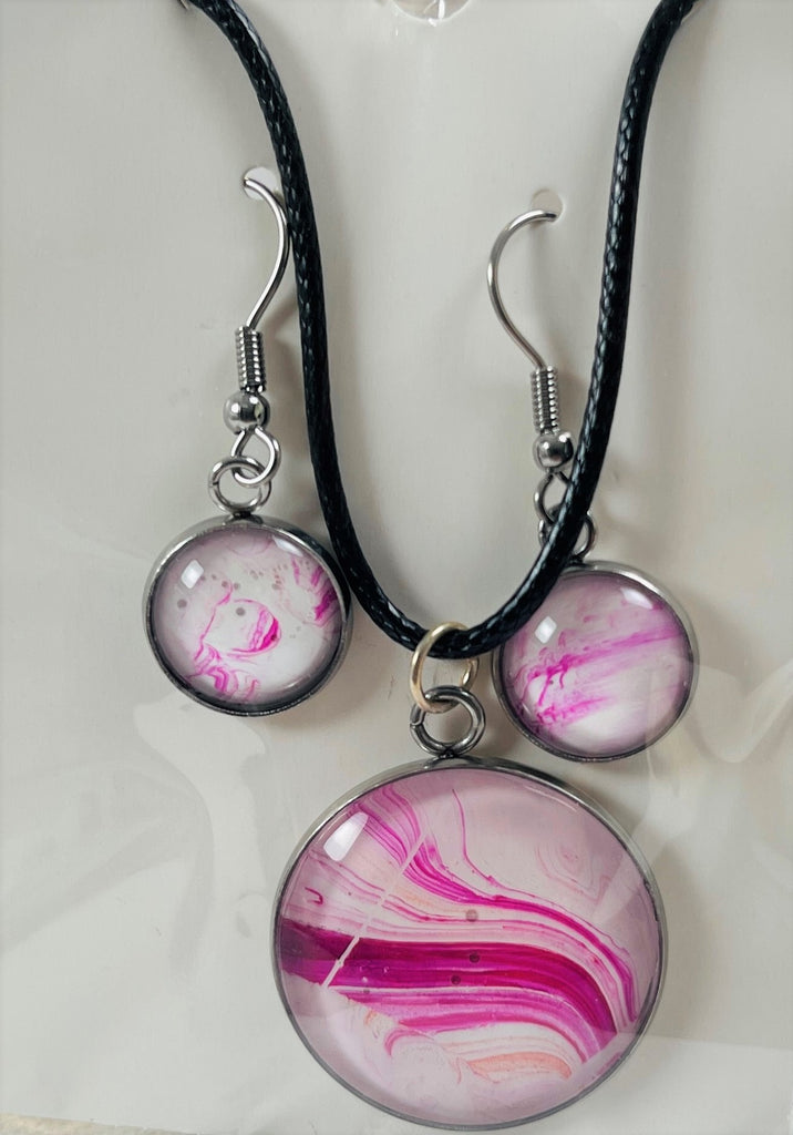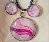 Acrylic paint poured skin set on round bezel with glass cabochon with matching handmade earrings. Comes with an 18" black waxed band but you can easily change it out.