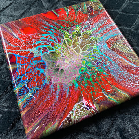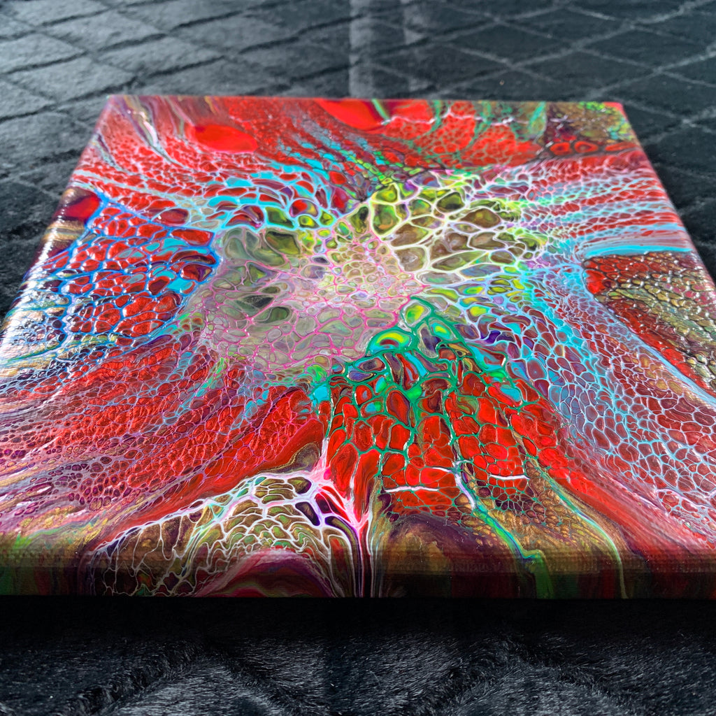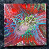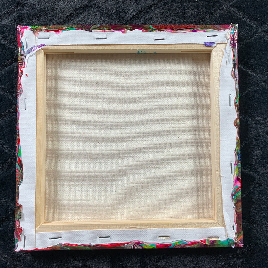 Don’t you love hand-made art? This beautiful 'Resolved Chaos' is an original, handmade acrylic flow painting on a gallery wrapped canvas, 8 in x 8 in. The lively colors and patterns of this unique wall art make it ideal for home decor or livening up the office. It also makes it a great gift for a special person. The painting continues over the sides and comes ready to hang. You can either use the hanger provided, or you can easily remove it and hang it in any direction you like flush with the wall by hanging it over two screws attached to the wall.
